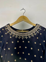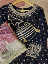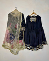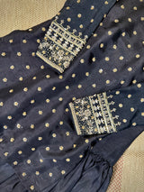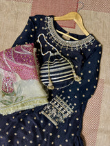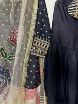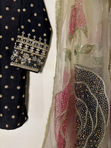 Grace meets tradition in our exquisite gharara set. The hand-embellished shirt features a delicately worked neckline and beautifully detailed sleeves, complemented by a gharara with an elegant gotta patti border. Completing the look is a breathtaking hand-painted pure organza dupatta, adorned with intricate hand embellishments.
