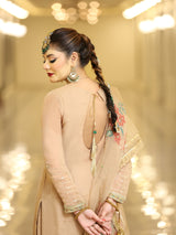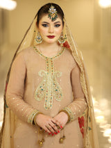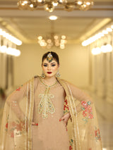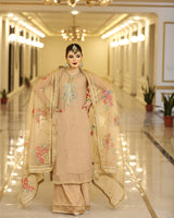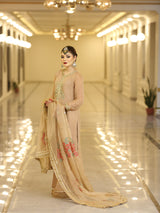 A gold organza dupatta with vibrant hand painted motifs heavily hand embellished with golden dabka and sequins along with gotah finishings at the hems making it an outstanding piece.