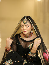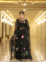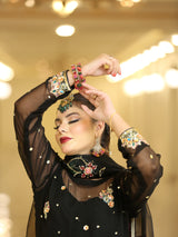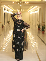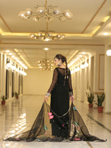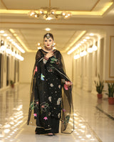 This black outfit is an epitome of perfection. The pure chiffon shirt is beautifully embellished with detailing of gold dabka, naqshi as well as pink, mustard, turquoise, red and gold sequins along with orange and green resham. Sleeves of this vibrant shirt are also hand worked with similar detailing at the hems. It is paired with plain raw silk plazzo.