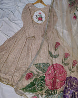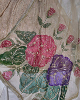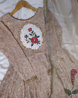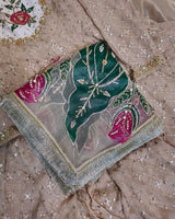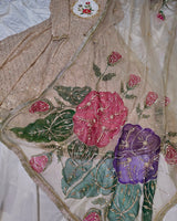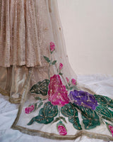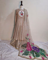 A breathtaking sequins peshwas featuring a statement neckline with intricate hand-painted and handwork embellishments on both front and back. Paired with a pure tissue sharara and a heavily embellished pure organza dupatta adorned with delicate hand-painted details, this ensemble exudes elegance and artistry.