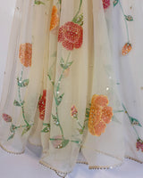 This chiffon hand-painted dupatta is a true work of art. Crafted from delicate chiffon fabric, it features exquisite hand-painted designs that showcase intricate detailing and vibrant colors. To add a touch of elegance and luxury, the dupatta is adorned with tasteful embellishments, creating a unique and stylish accessory that complements any outfit beautifully.
