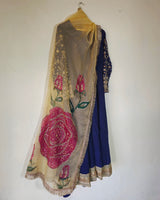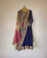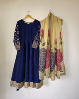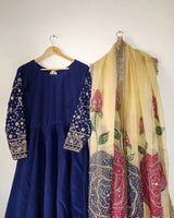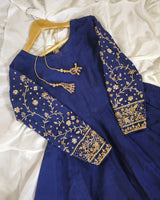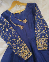 Discover our elegant navy blue raw silk peshwas, featuring heavily embellished sleeves. It comes with a stunning pure organza hand-painted dupatta in a contrasting color, beautifully adorned with intricate embellishments.