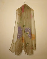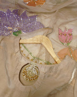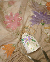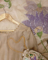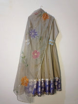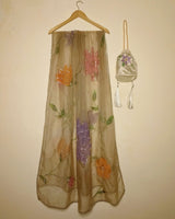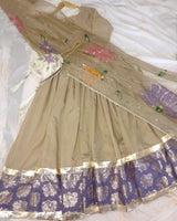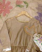 Experience the allure of a magnificent skin gold peshwas with a lavish flare. It's elegantly paired with a beautiful organza dupatta adorned with hand-painted details and exquisite hand embellishments. Together, they create a truly enchanting ensemble.