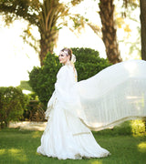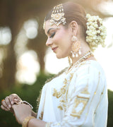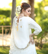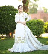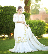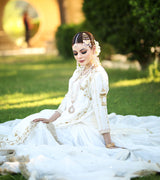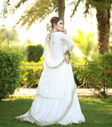 Shirt curated on korean raw silk in white colour with intricate handwork including antique hues of golden dabka, sequins, sitara and zardosi craftmenship. Its 3 yard pure chiffon dupatta is adorned with four sided border and allover spray work as well as kiran on all sides. Completing the look with crushed silk lehenga embellished with tilla patch and lace on border.