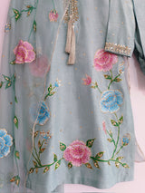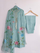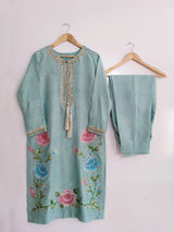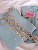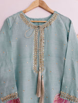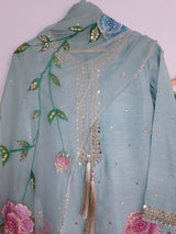 Elegance meets craftsmanship in our made-to-order cyan three-piece dress. Crafted from Korean raw silk, it features a hand-embroidered neckline and hand-painted details on the daman. The ensemble is elevated with intricate hand embellishments, and it comes complete with a stunning chiffon dupatta adorned with hand-painted work, dabka, pearls, and sequins for a touch of timeless charm.