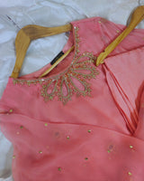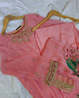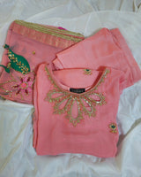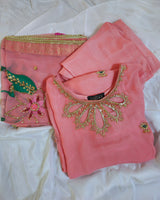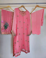 Shirt is curated on pure chiffon with intricate craftsmanship of adda work. It is paired with a beautiful pure chiffon dupatta meticulously painted by hand along with hand embellishments.
