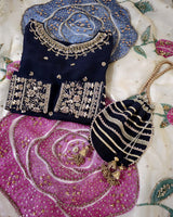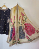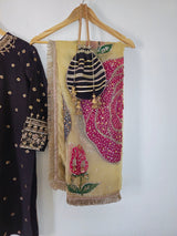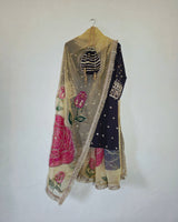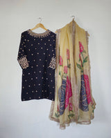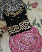 A black raw silk shirt with a beautifully embellished round neckline and heavily embellished sleeves featuring intricate details. It is paired with a stunning hand-painted and heavily embellished pure organza dupatta.