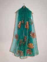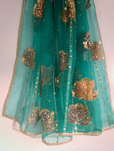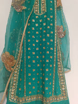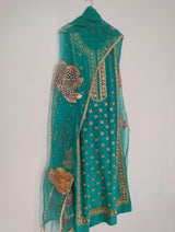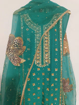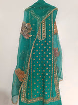 It is paired with a pure silk organza dupatta, showcasing hand-painted details that exhibit a unique artistic touch. To complete the ensemble, the dupatta is adorned with hand embellishments of sequins, adding a touch of sparkle that perfectly complements the ornate shirt. This combination promises a regal and luxurious outfit that's bound to capture attention.
