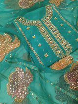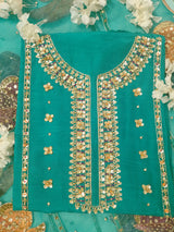 Introducing our exquisite new teal three-piece unstitched set. It features a meticulously handcrafted Korean raw silk shirt adorned with intricate embroidery and a plain Korean raw silk trouser.