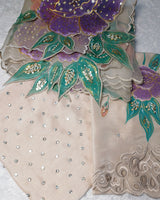 This is our exquisite three-piece unstitched set featuring a Korean raw silk shirt allover adorned with dazzling rhinestones and hand-painted sleeves showcasing intricate machine thread cutwork. It is paired with plain pants.