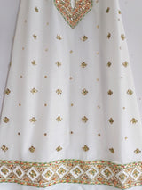A heavily hand-embroidered raw silk ivory shirt is a masterpiece of craftsmanship and elegance. Statement neckline is intricately hand-embroidered by skilled artisans using gold sequins and dabka along with orange, red and green beads. The daman and sleeves of shirt are also embellished with delicate patterns and motifs come to life in meticulous detail, showcasing a harmonious blend of art and fashion.