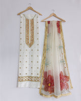 It is paired with an ivory hand-painted pure silk organza dupatta with hand embellishments of gold dabka and sequins as well as kiran on all sides.